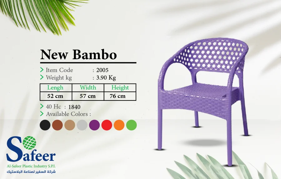 في إطار سعي شركة السفير لصناعة البلاستيك للتجديد في أشكال الكراسي لتناسب كافة الأغراض؛ صممت هذا المنتج المميز والذي أطلقنا عليه اسم كرسي نيو بامبو.